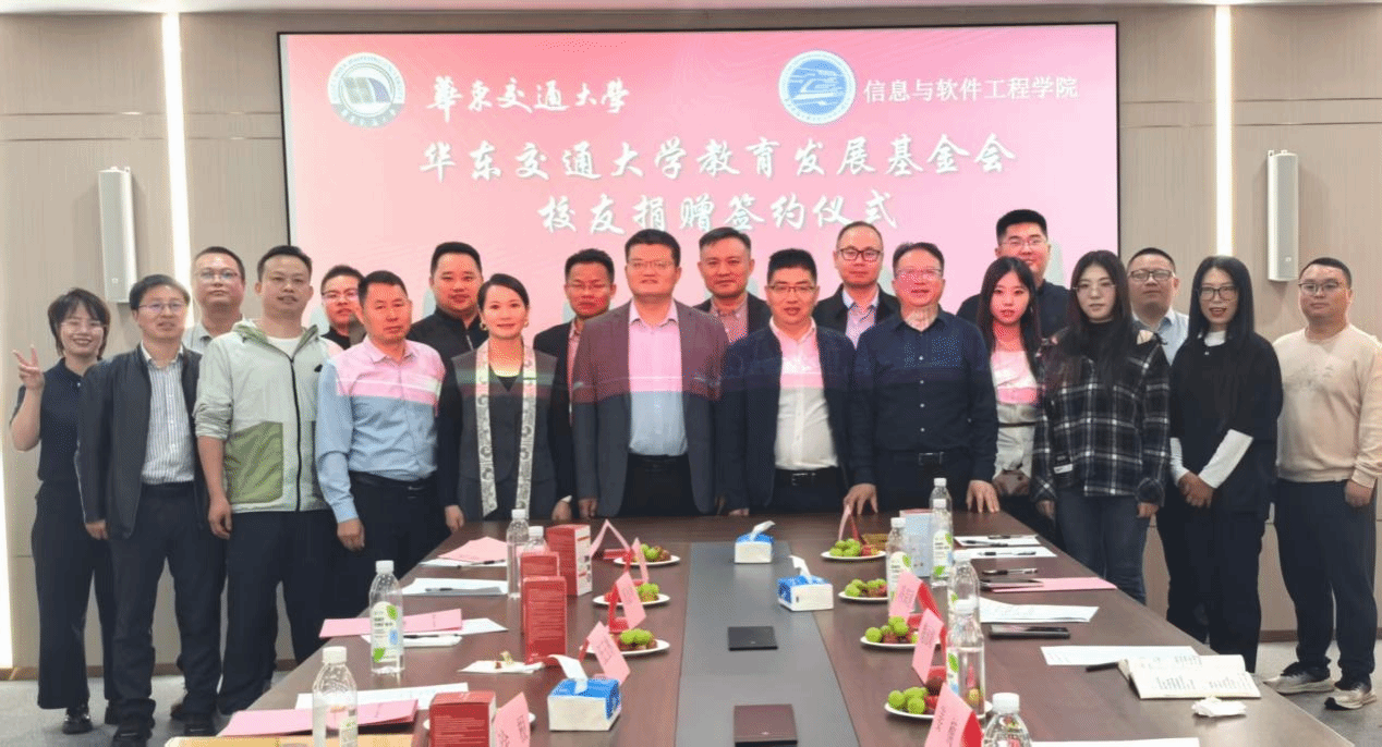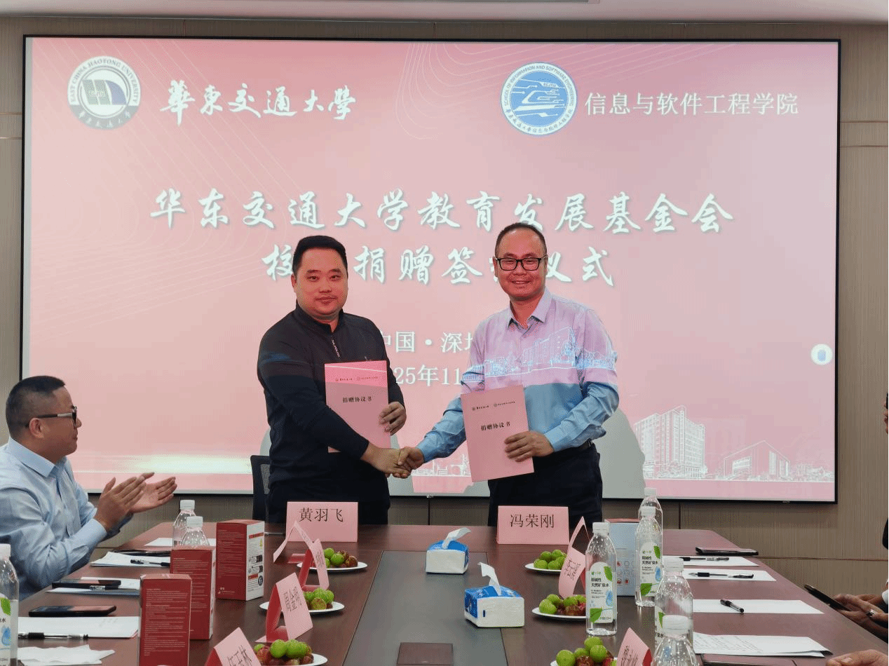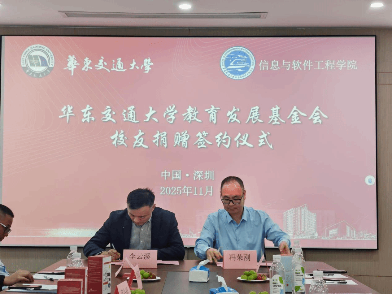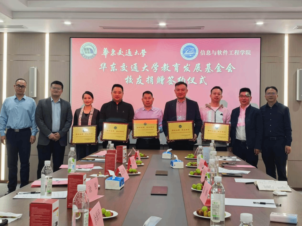 仪式上,学院1997级计算机科学与技术校友、华为技术有限公司产品总监李云溪,2001级软件工程校友、深圳博睿合创科技有限公司董事长周金明,2001级计算机科学与技术校友、江西北辰轨道交通设备有限公司总经理余姝丹,2002级计算机科学与技术校友、深圳市途铭科技有限公司总经理涂根,2004级软件工程校友、佛山市争先敢为科技有限公司董事长董颖,2006级软件工程校友、广东与凡科技有限公司总经理袁衎清,2008级软件+机械电子工程校友、深圳正翊电气有限公司总经理黄羽飞,2011级软件工程校友、深圳市开普视通科技有限公司总经理李斌代表广大校友向华东交通大学教育发展基金会进行捐赠。此次捐赠资金将专项用于学院办学环境改善、人才培养等。