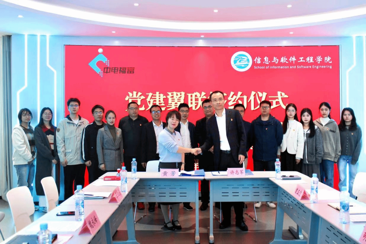 创新创业学生党支部与中电福富信息科技有限公司云业务第一党支部在华东交通大学“火车头”党建活动中心举行党建共建签约仪式。学院党委书记魏永峰出席仪式并讲话,院党委委员、组织员王业贵,组织员、创新创业学生党支部书记黄芳,党支部副书记、实验中心与院双创中心副主任黄德昌;中电福富信息科技有限公司云业务第一党支部书记、高级副总监许志军,青年委员、交付部总经理胡飞飞,纪检委员、云运营产品部总经理曾正宜,宣传委员、云运营产品部副总经理郭永该以及双方党员代表参加仪式。仪式由学院团委书记李萌萌主持。